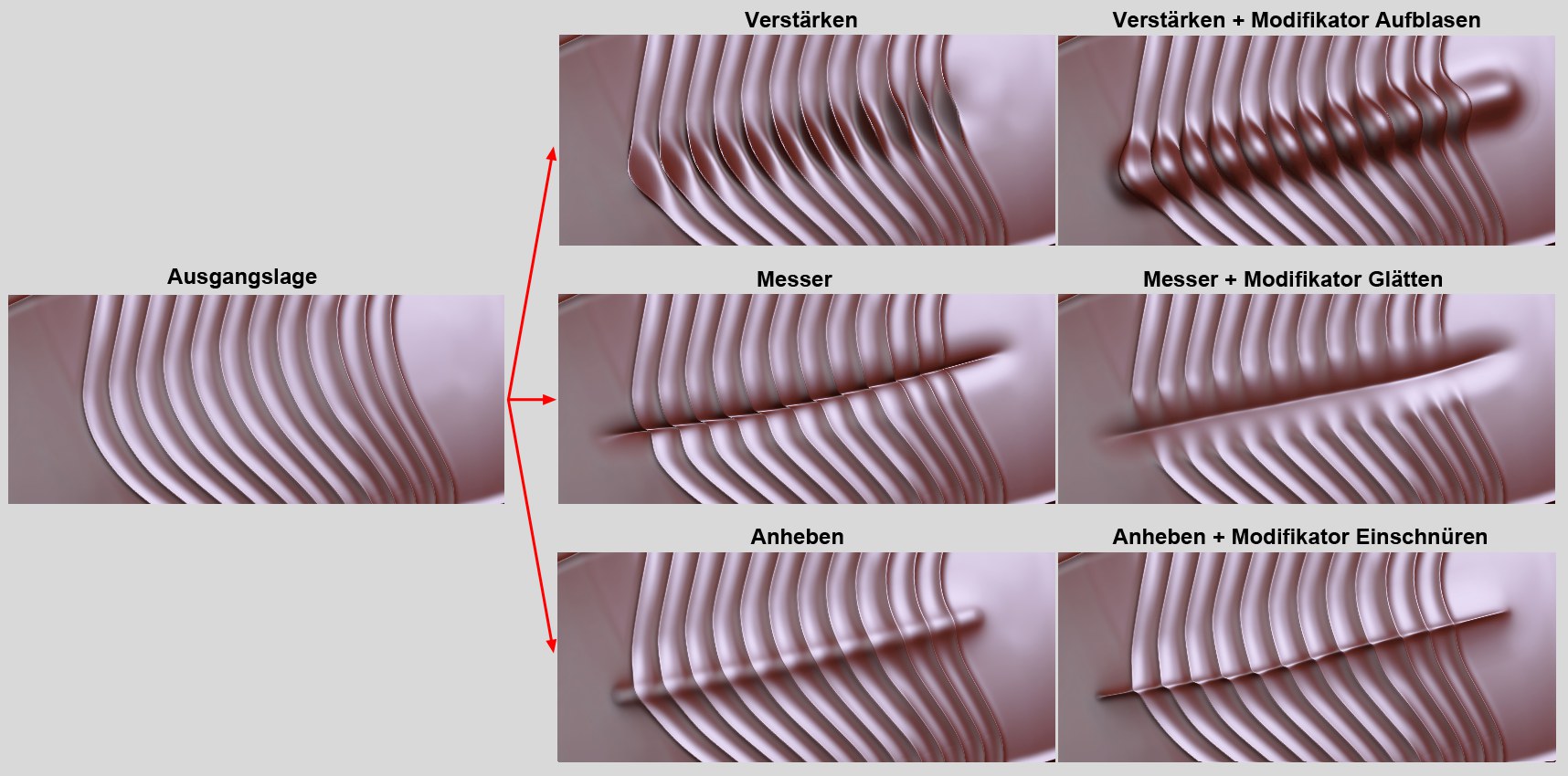Mittels der Modifikatoren können für den aktuellen Pinsel zusätzlich einige andere Pinselwirkungen hinzugefügt werden. D.h. zum Beispiel, dass der Messer-Pinsel auch gleichzeitig die Funktion des Glätten-Pinsels ausüben kann (wie in obigem Beispiel).
