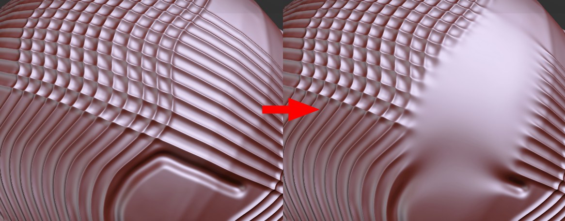 Obwohl nicht auf den ersten Blick ersichtlich, ist der Glätten-Pinsel einer der wichtigsten Sculpting-Pinsel. Bei vielen Sculpting-Aktionen (z.B. mit einem filigranen Stempel) können sich beim Formen aufgrund der begrenzten Unterteilung inhomogene Artefakte wie bei diesem Beispiel links bilden: