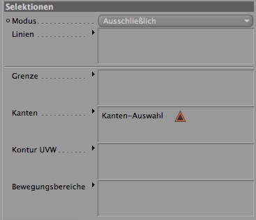 Hier spezifizieren Sie alle Selektionen, die vom Tag oder dem Post-Effekt verwendet werden soll. So können Sie z.B. hier bestimmen, welches UVW-Tag für UVW-Linien herangezogen werden soll.