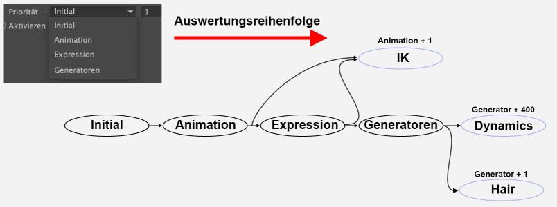 angegeben.Im Falle der Dynamics z.B. (Priorität Generator +400) sind diese Prioritäten komplett intern definiert und können nicht geändert werden, d.h. beispielsweise, dass Expressions (die z.B. eine Punktposition auslesen), die auf durch die Dynamics deformierte Objekte zeigen, eine Priorität von mind. Generator +401 benötigen.