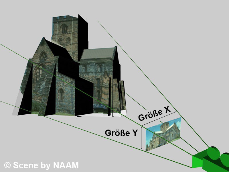 Wenn Sie diese Projektionsart einstellen, wird die Textur immer aus Sicht der Kamera auf das Objekt projiziert. Dabei stimmt die Textur (bei gleichen Offset- und Längenwerten) exakt mit dem Vorder-/Hintergrundbild überein.