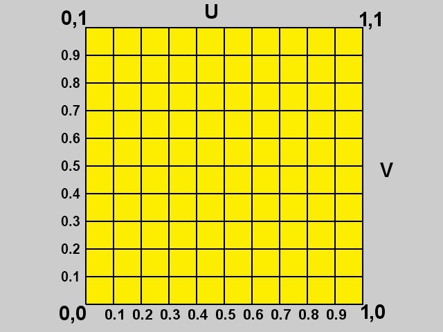 Der UV-Wertebereich beginnt bei der Koordinate 0,0 und geht bis 1,1. Bei einem hochkant stehenden Polygon beschreiben nun 0,0 den unteren linken, 0,1 den oberen linken, 1,0 den unteren rechten und 1,1 den oberen rechten Stützpunkt. Zwischen diesen vier Koordinaten wird jetzt eine Textur "aufgespannt". Haben Sie statt einem einzigen Polygon z.B. eine unterteilte Ebene, dann wird der UV-Bereich von 0,0 bis 1,1 dazwischen aufgeteilt.