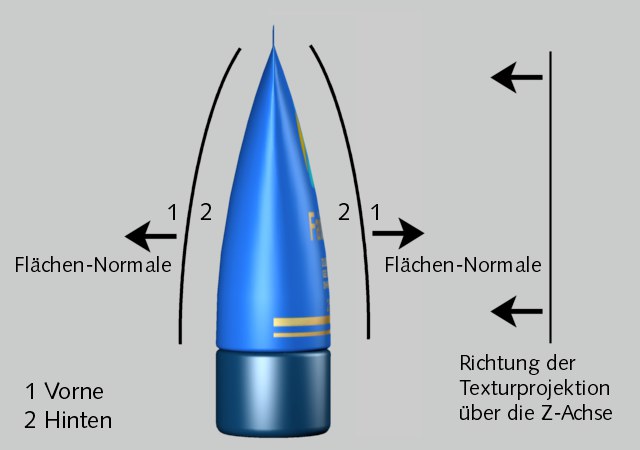 Sie möchten auf eine Cremetube ein Etikett aufbringen. Mit der Flächen-Projektion sollte das recht einfach möglich sein. Lassen Ihre Tube berechnen. Doch was ist das, auf der Rückseite der Tube ist die Textur spiegelverkehrt zu sehen.