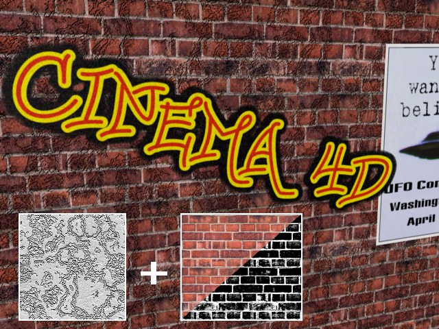 In dem vorhergehenden Beispiel wurde ein Mauermaterial mit einem Farb- und einem Relief-Kanal erstellt. Der Relief-Kanal erzeugt beim Berechnen des Bildes den Eindruck, als hätte die Mauer Fugen und Rillen. Jetzt soll aber z.B. noch eine zusätzliche Relief-Struktur auf die Mauer kommen, ohne dass die Textur selbst verändert werden muss. Unmöglich sagen Sie ... mit Cinema 4D kein Problem sagen wir!