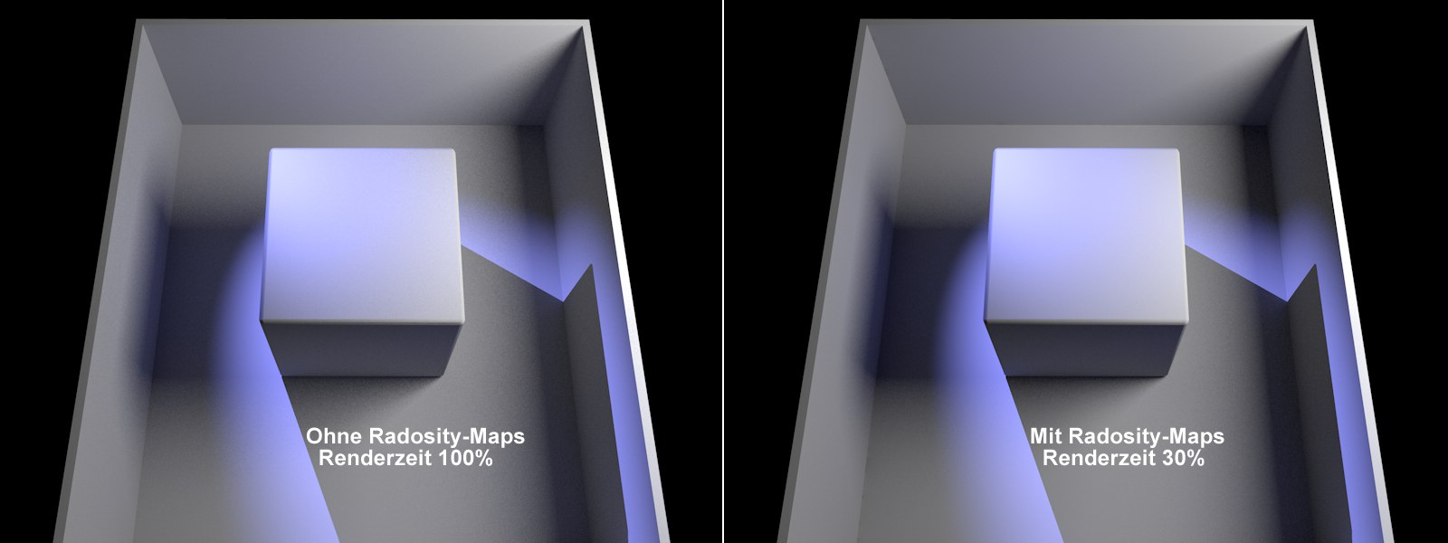 Bei obigem Beispiel ist die Renderzeit stark reduziert bei ähnlichem Renderergebnis. Mit Radiosity-Maps ist es etwas dunkler (reduzierte Strahltiefe) in den Ecken und Schatten.
