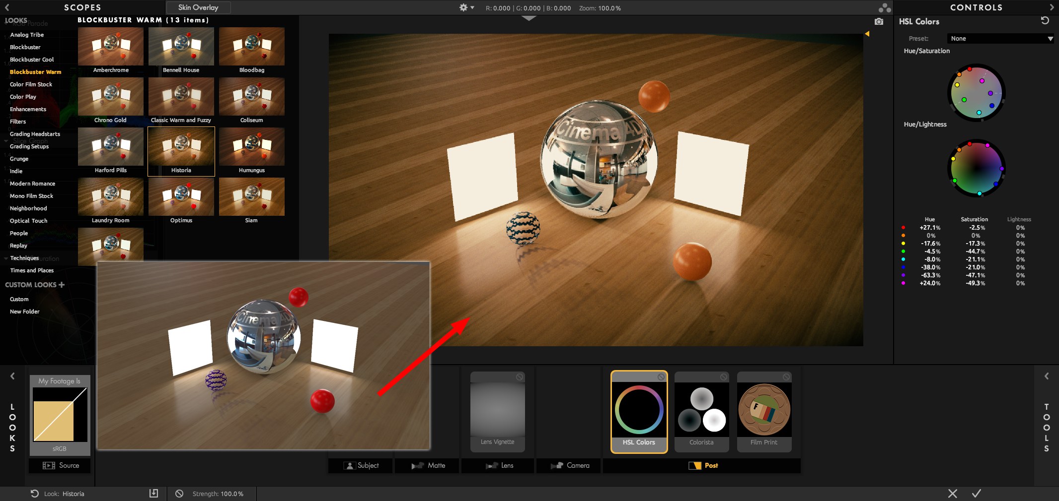 Oder denken Sie z.B. an den Film "Die fabelhafte Welt der Amélie": der ganze Film ist in einem gelb-grünlichen Farbton gehalten. Solcherlei Effekte fallen zwar schon mehr in den Bereich des "Color Gradings". Nichtsdestotrotz können alle diese Effekte (und noch einige mehr) mit Red Giants Magic Bullet Looks, das in Cinema 4D als Post-Effekt integriert wurde, realisiert werden.