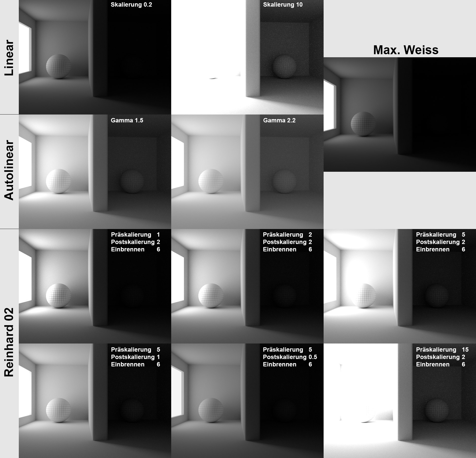Wie Sie anhand der Abbildungen erkennen können, arbeitet hier "Autolinear" (in Verbindung mit Gamma) am besten: allzu helle Bereiche werden abgedunkelt, während dunkle aufgehellt werden. "Reinhard" funktioniert bei vorliegender Szene nicht so gut: sehr dunkle Bereiche können nicht adäquat aufgehellt werden. Dieser Operator arbeitet am besten bei Szenen, die gleichmäßiger beleuchtet sind und keine sehr dunklen Bereiche aufweisen (also z.B. bei Innenraumrenderings).
