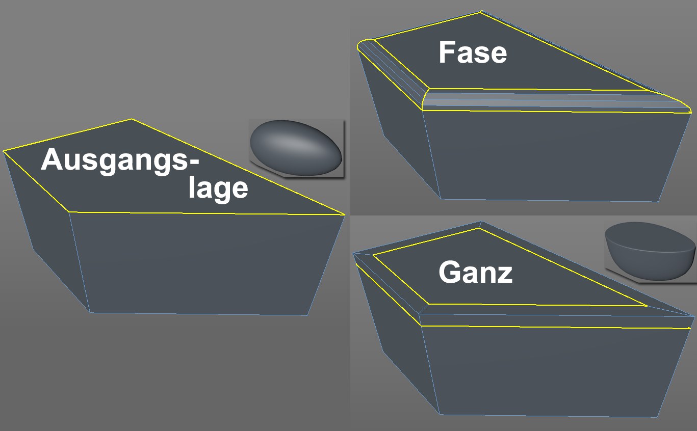 Sie haben hier die Auswahl, ob selektierte Komponenten gefast (Fase) werden – das ist das, was man sich gemeinhin unter "Bevel" vorstellt – oder ob parallele Kanten (Ganz) zu den selektierten entlang der angrenzenden Polygone eingefügt werden sollen. Letzteres wird dazu verwendet, Kanten (und nur diese; Ganz funktioniert weder im Punkte- noch Polygonmodus) bei Subdivision Surfaces zu akzentuieren.