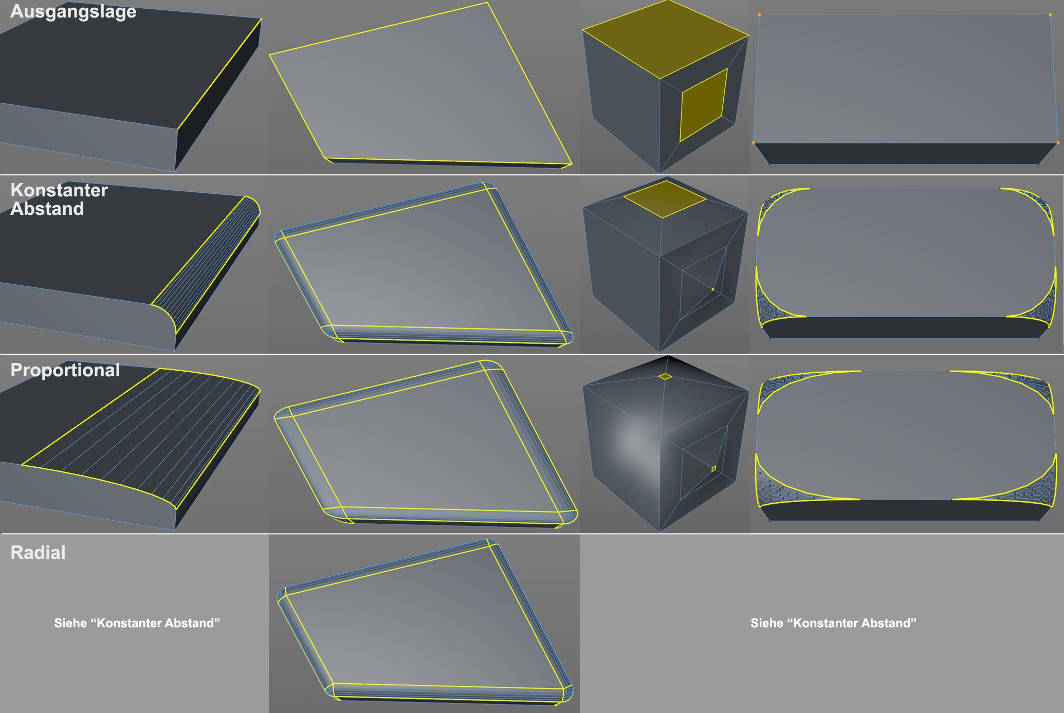 Hierbei wird versucht, der abgerundeten Ecke eine exakt kugelförmige (erhöhen Sie hierzu Unterteilung) Form zu geben, was in den anderen Modi nicht unbedingt der Fall ist. Mit Offset können Sie den Radius dieses Kugelausschnitts bestimmen.