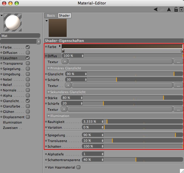 Dies sind die Einstellungen für das sekundäre Glanzlicht. Sie verhalten sich so, wie eben beim primären Glanzlicht beschrieben.