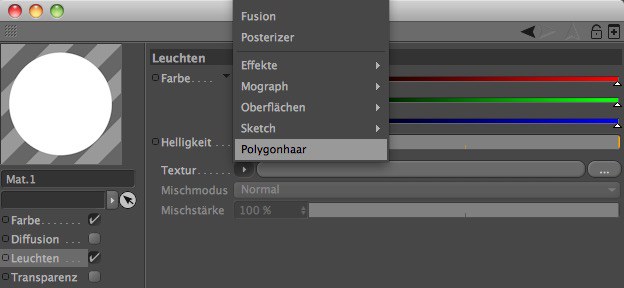 Wenn Sie Polygonhaar (s. Tab Generieren) rendern wollen, gibt es den Polygonhaar-Shader, den Sie in einem normalen Cinema 4D Material in den Leuchten-Kanal laden können.