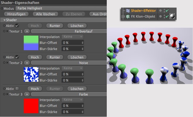 Klon-Objekt zugewiesene Material hat den Multi-Shader eingeladen. Der Shader-Effektor regelt mit einem