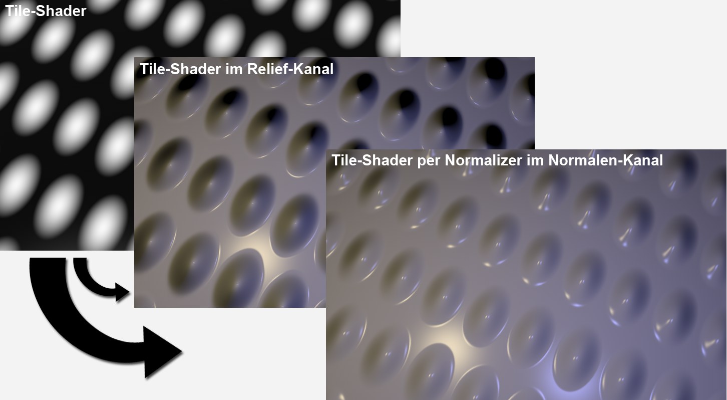 Mit Hilfe des Normalizer (der in den Normale-Kanal gehört) können Sie ganz normale, bisher für Relief-Maps verwendete Texturen für den Normale-Kanal verwenden. Der Normalizer wertet dabei Kontraste aus, um Kanten zu erkennen und berechnet daraus eine Normal-Map. Nochmal zur Erinnerung: prinzipiell machen Relief- und Normalen-Maps ähnliches. In RGB-Bilder kodierte Informationen beeinflussen beim Rendern die echten (Geometrie-)Oberflächennormalen und täuschen detaillierte Strukturen vor. Normalen-Maps können im Gegensatz zu Relief-Maps auch die Normalen-Richtungen "verbiegen”, was realistischere Rendereffekte ermöglicht (beachten Sie in obiger Abbildung die Glanzlichter auf den Noppen).