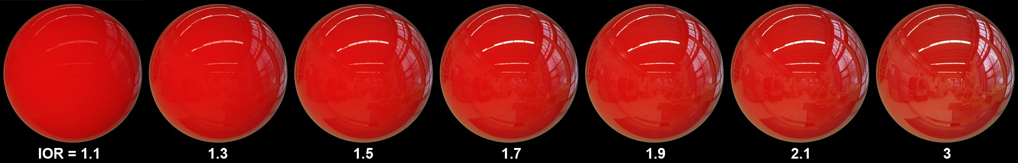 Den Brechungsindex kennt man normalerweise nur von Lichtbrechungseffekten, tatsächlich stellt dieser aber auch ein Maß für die Lichtreflexion eines Materials dar (unabhängig davon, ob es transparent ist oder nicht). Wie Sie in obiger Abbildung erkennen können, reflektiert das Material bei kleinen IOR-Werten fast nur in Bereichen, wo die Kamera sehr flach (Kantennähe!) auf das Objekt blickt. Bei größeren Werten reflektieren dann auch zunehmend frontalere Objektbereiche.