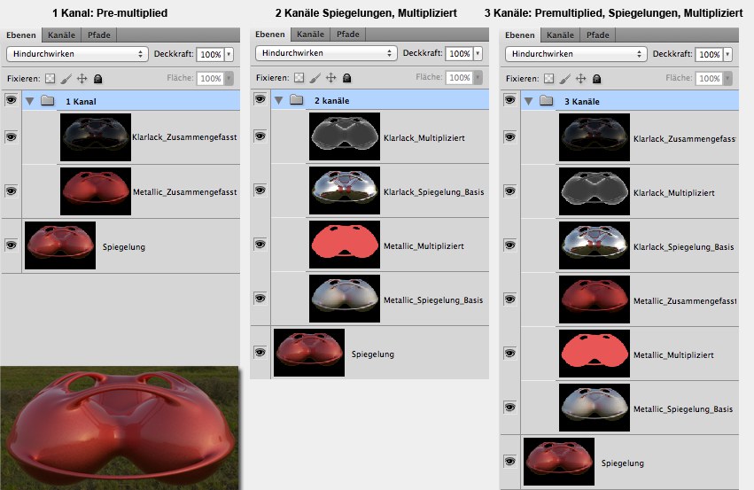 Reflektivitätsebenen namens "Klarlack" und "Metallic" mit den aufgesplitteten Multi-Pass-Ebenen in