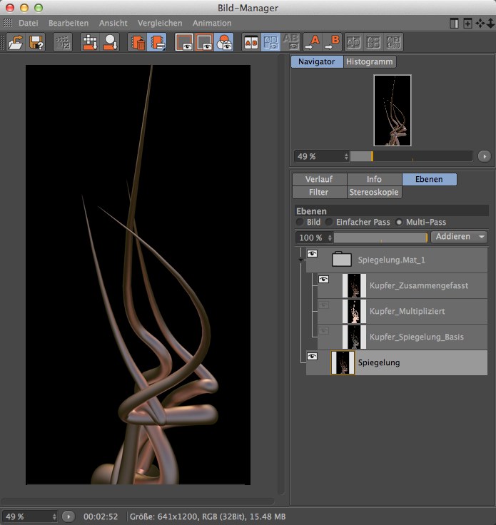 Sie sehen dort neben der Ebene "Spiegelung" (alle Spiegelungen kombiniert) im Ordner "Spiegelung.Mat_1" 3 Ebenen. Wenn Sie eben genannten Ordner mittels des Augen-Icons sichtbar schalten, wird ebenfalls die Ebene (und nur diese) "Kupfer_zusammengefasst" aktiviert. Warum das? Nun, "Kupfer_zusammengefasst" ist wiederum aus den beiden Ebenen "Kupfer_Multipliziert" und "Kupfer_Spiegelungs_Basis" zusammengesetzt. Würden Sie die beiden letzten auch noch aktiv schalten, würden effektiv 2 Spiegelungen wirken.