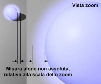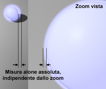 La dimensione dell’alone è definita come percentuale della dimensione della vista. Se volete che l’alone aumenti quando zoomate sugli oggetti, attivate le opzioni Scala Zoom e Scala Distanza.