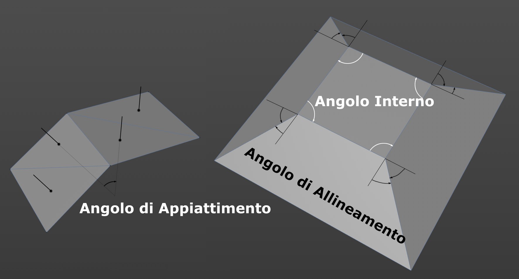 quadrilateri risultanti è possibile definire l’angolo da utilizzare.I 3 settaggi disponibili per gli angoli sono descritti qui sotto. L’algoritmo utilizza questi settaggi per definire quali triangoli andranno usati per formare il quadrilatero (nel caso di Angolo di Appiattimento, anche per formare un n-gon).