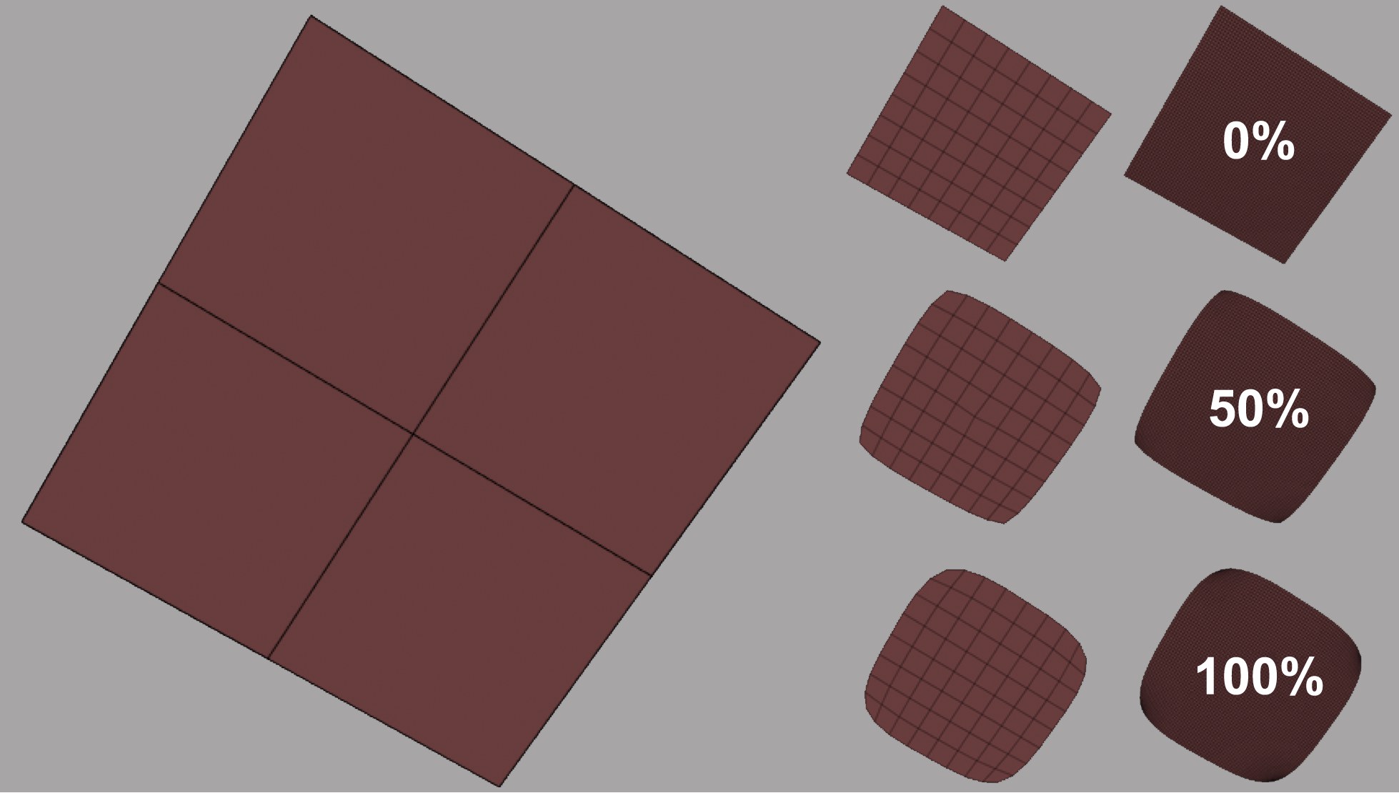 Dieser Parameter definiert beim Klicken auf den Button Unterteilen, wie das Objekt gemäß einer von den Subdivision Surfaces gewohnten Abrundung unterteilt wird. Bei 0% bleibt die ursprüngliche Form erhalten, während 100% genau wie ein Subdivision Surfaces unterteilt. Es sind natürlich auch Zwischenwerte möglich.