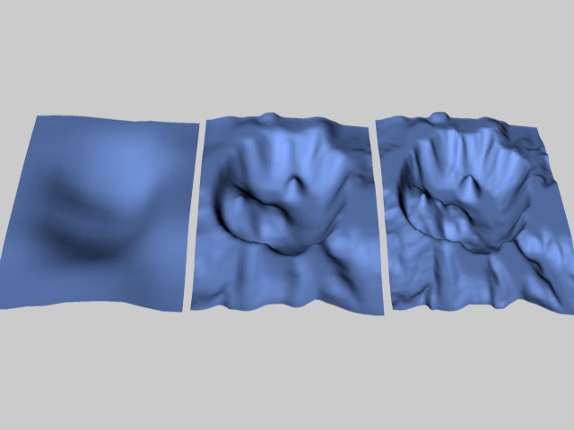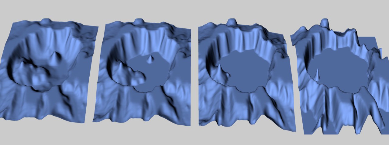 Der Wert arbeitet invers zur eben beschriebenen Bodenhöhe. Anstatt von unten wird die Landschaft nun von oben her abgeschnitten. Die Folge hieraus ist, dass Sie nun eine Ebene erhalten, wenn die Plateauhöhe 0% erreicht hat. Nach dem Abschneiden wird das Objekt wieder auf volle Höhe gezogen, d.h. die Berge werden immer steiler.