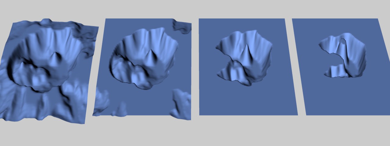 Mit dem Wert bestimmen Sie, auf welcher Höhe das Wasser liegen soll. Je höher Sie den Wert wählen, desto weiter rutscht die Landschaft in den Boden hinein. Bei 100% ist also die gesamte Landschaft verschwunden – Sie erhalten eine einfache Ebene. Nach dem Abschneiden wird das Objekt wieder auf volle Höhe gezogen, d.h. die Berge werden immer steiler.