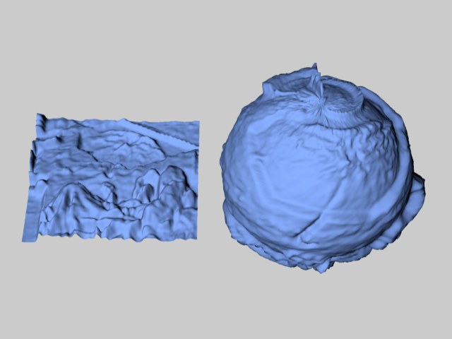 Über die Option können Sie Ihr Relief auf eine Kugel wickeln. Der Radius dieser Kugel ergibt sich aus der halben Breite, die Höhe aus der Höhenangabe (siehe oben).