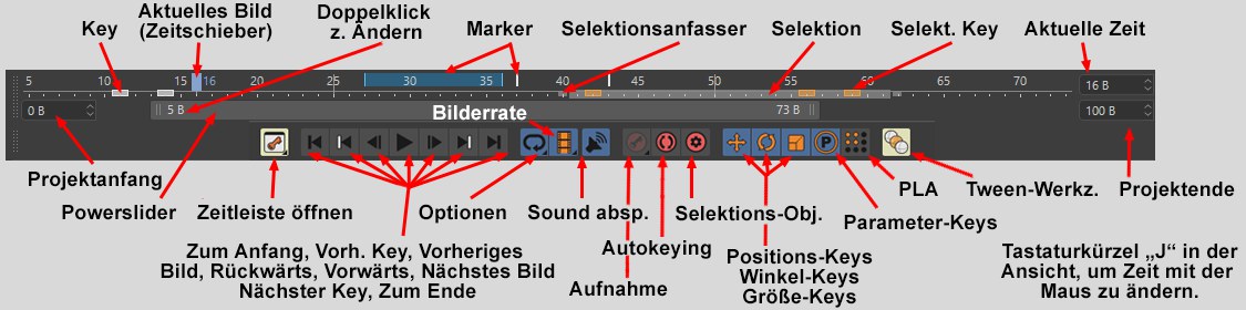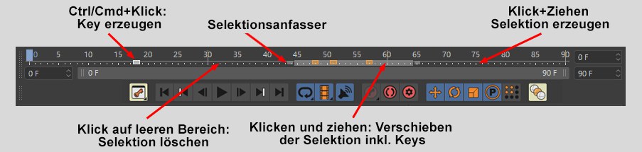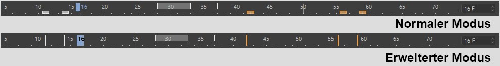 Das Zeitlineal: Das Zeitlineal besteht wiederum aus 2 Hälften. In die obere Hälfte kann geklickt werden, um das aktuelle Bild zu setzen. Drücken Sie Ctrl/Cmd + Shift um zum aktuellen Zeitpunkt einen Marker zu setzen. In der unteren Hälfte werden die Keys des aktuell selektierten Objekts und evtl. Selektionen dargestellt. Mit den Hotkeys 1 und 2 können Sie das Zeitlineal verschieben und skalieren.
