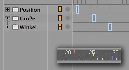 Positions-, Größe-, und Winkel-Keys werden farblich verschieden und an verschiedenen, vertikalen Positionen im Zeitlineal angeordnet: