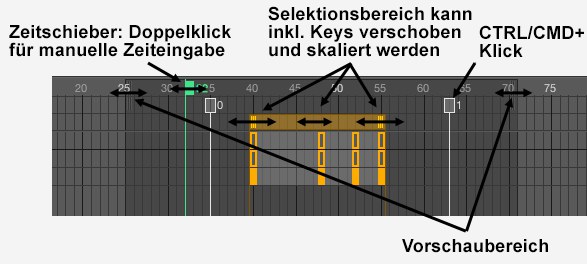 - Der Selektionsbereich (nur im Dope Sheet-Modus vorhanden) umfasst immer die äußeren zeitlichen Grenzen einer Key-Selektion, dieser Bereich wird also primär automatisch erstellt, wenn Sie eine Animationsspur oder Keys auswählen. Er umfasst dabei die komplette Zeitspanne zwischen erstem und letztem Key der Selektion. Sie können alternativ mit gedrückter Shift-Taste interaktiv eine Selektion in der unteren Hälfte des Zeitlineals aufziehen. Dieser Selektionsbereich umfasst dann alle vorhandenen Keys innerhalb dieses Zeitbereichs. Der Selektionsbereich kann verschoben oder durch Verschieben der Anfasser zeitlich inklusive der enthaltenen Keys skaliert werden.