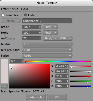 Sie haben jetzt zwei Optionen: Sie können eine neue Textur anlegen, wobei Sie Größe, Farbmodus etc. angeben, oder Sie laden eine bestehende Textur, die als Datei auf Ihrer Festplatte (oder welches Speichermedium Sie auch immer benutzen) schlummert.