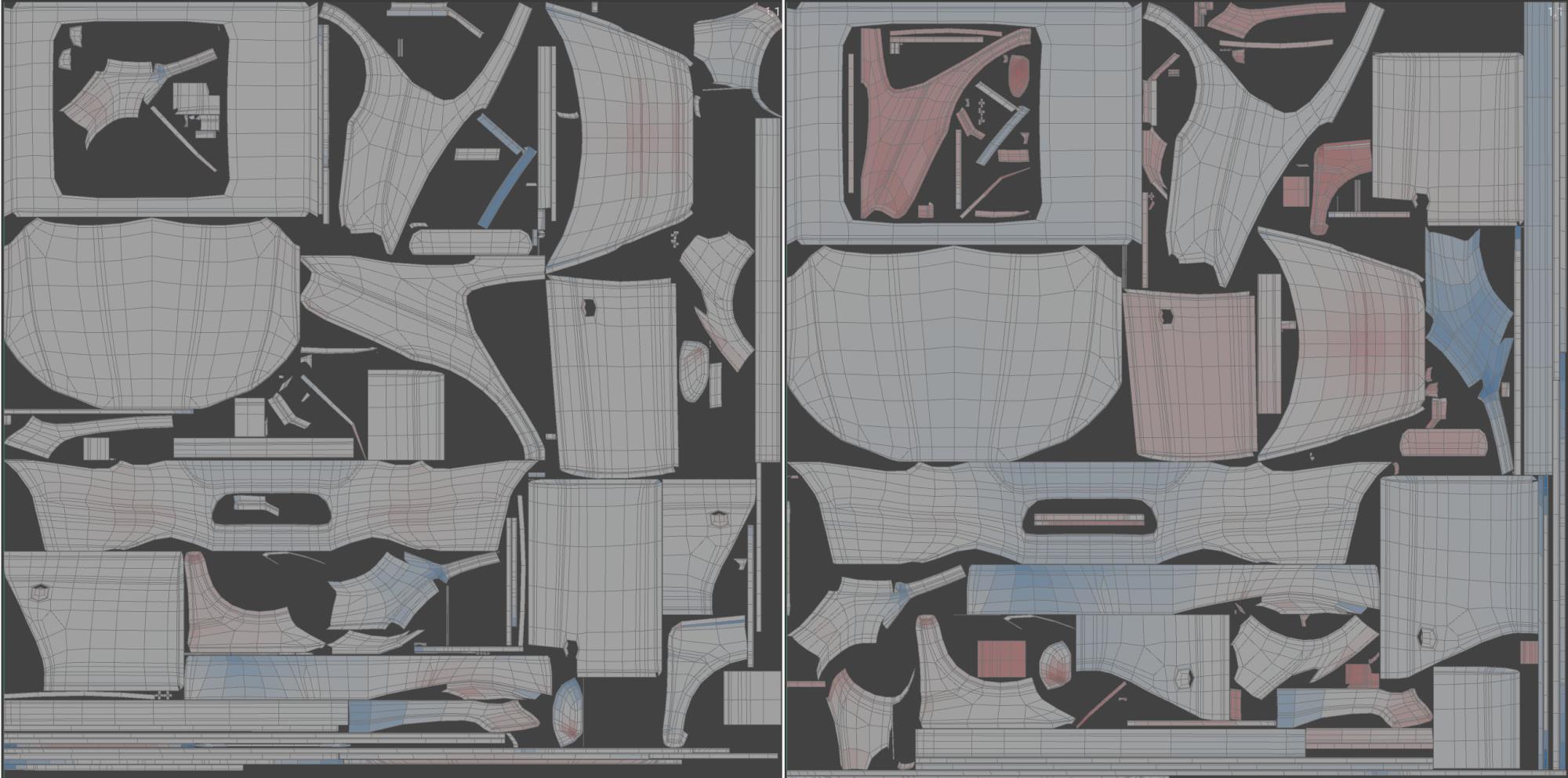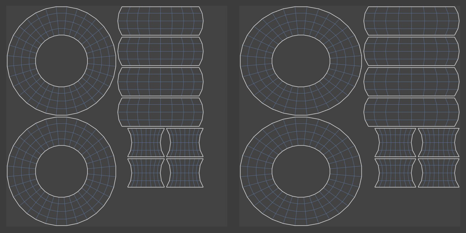 Links kleiner Wert für Dehnen erlauben, rechts großer. Das UV-Mesh belegt rechter Hand 10 Prozentpunkte mehr Texturfläche.