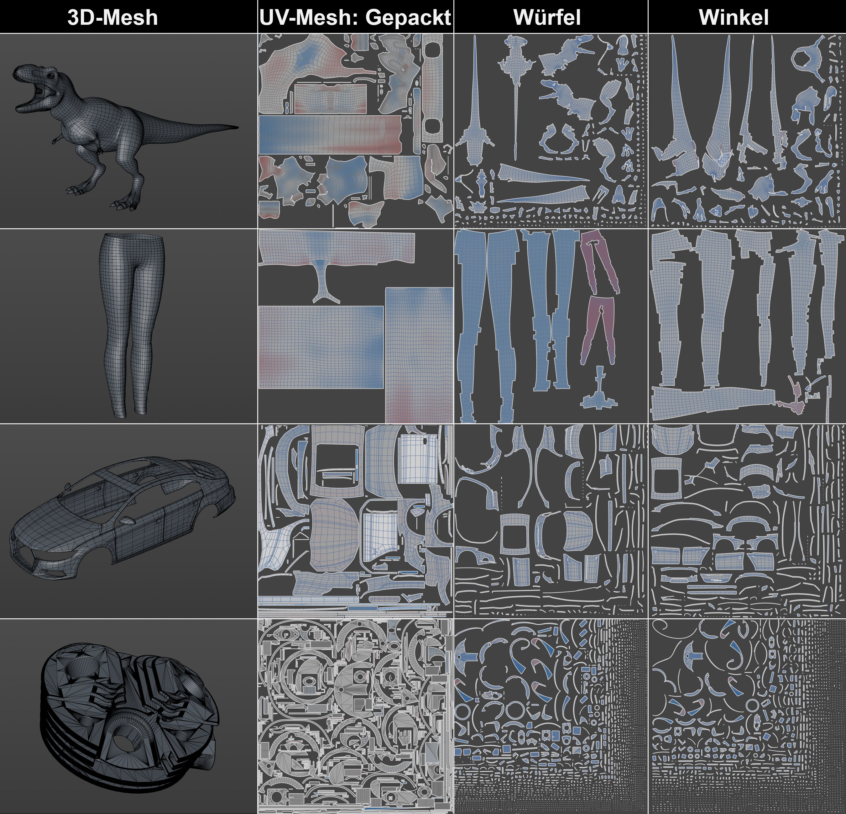 Die verschiedenen automatischen Methoden, ein UV-Mesh abzuwickeln. Wie Sie unschwer erkennen können, führt Gepackt zu den besten Ergebnissen. Beachten Sie insbesondere, wie dicht die UV-Inseln gepackt werden können, wobei der Texturraum optimal ausgenutzt wird.