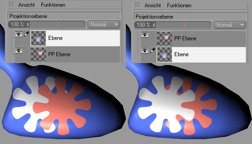 Es ist jetzt im Projection Painting Modus möglich, mit Hilfe des Ebenen-Managers mit temporären Ebenen zu arbeiten. Sobald Sie den Projection Painting Modus aktivieren, erscheint im Ebenen-Manager eine PP Ebene. Sie können jetzt ganz normal über die üblichen Befehle neue Ebenen anlegen, Ebenen per Drag&Drop in ihrer Reihenfolge ändern (wenn es Ihnen Freude bereitet, sogar Ebenensets anlegen) die aktive Ebene ändern etc. Sogar die Blendemodi funktionieren damit!