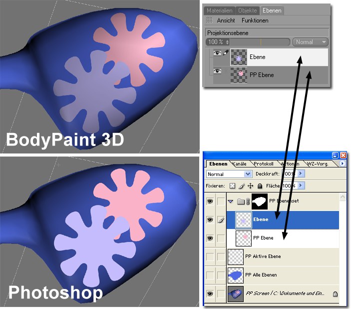 Die in Photoshop bearbeitete Datei kann jetzt in CINEMA 4D/BodyPaint 3D wiederum mittels des Befehls Textur hinzuladen (Rechtsklick auf Ebene: Textur/Textur hinzuladen) zu den immer noch temporären Ebenen hinzugeladen werden. Damit ist ein reibungsloser Texturaustausch mit Photoshop im Projection Painting-Modus möglich.