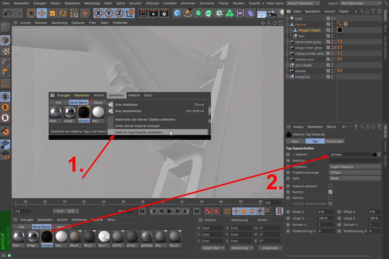 Material-Tags/Objekte selektieren. Nun sind alle Material-Tags und Objekte, die dieses Material benutzen, selektiert.