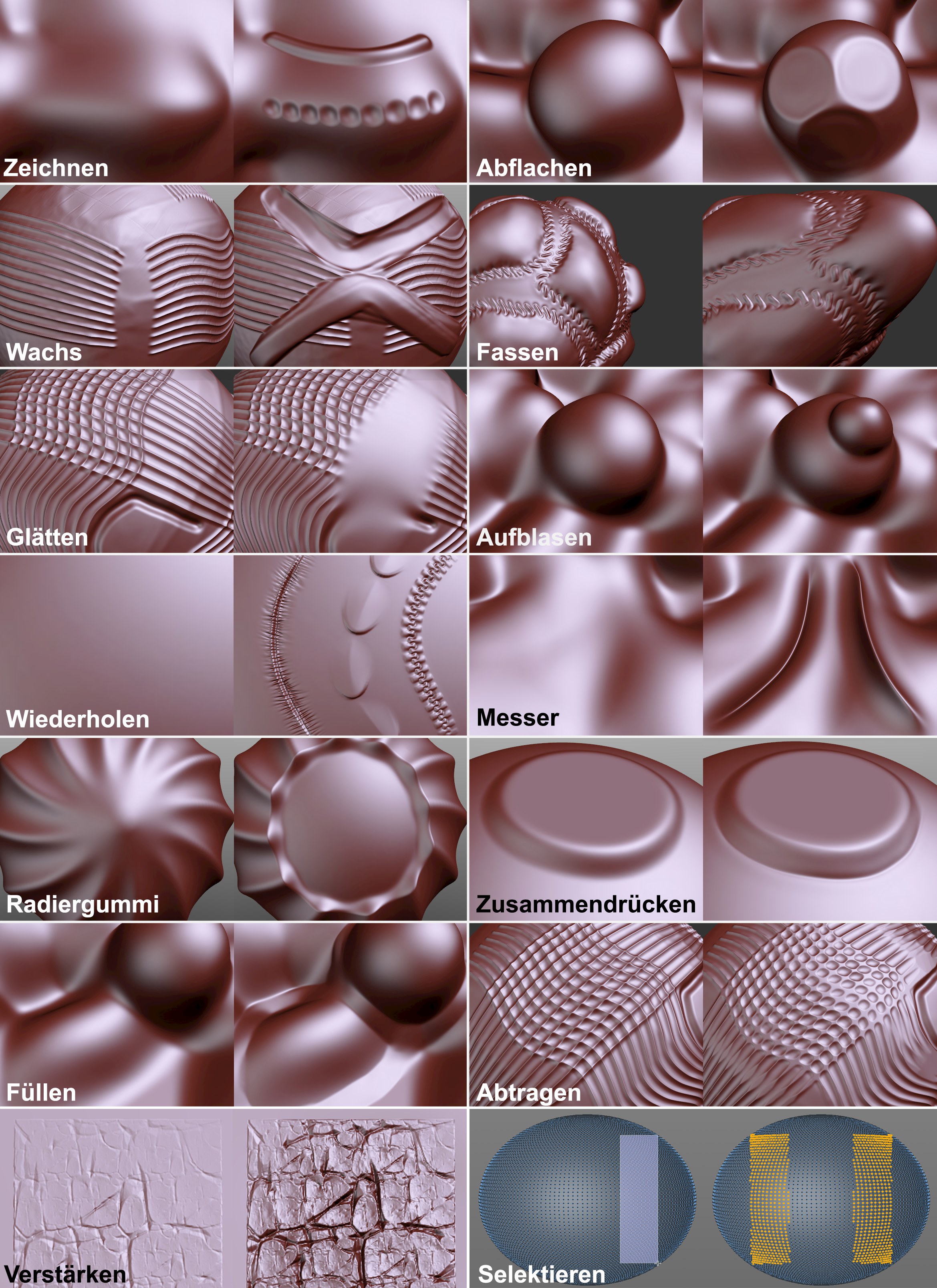 Außerdem können auch einige Deformer und Objekte mit Pinseln bearbeitet werden. Es sind dies: