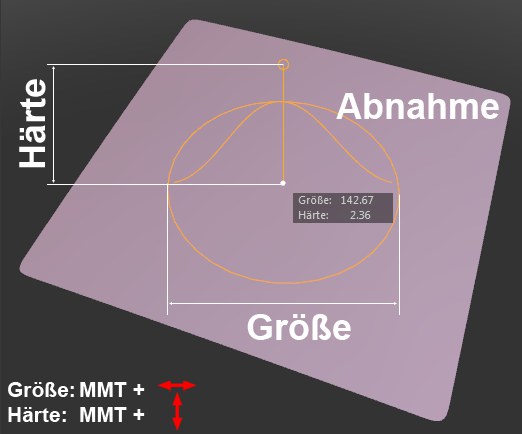 - mittlere Maustaste (oder Shift+Ctrl/Cmd) + Maus hoch/runter regelt die Pinselhärte.