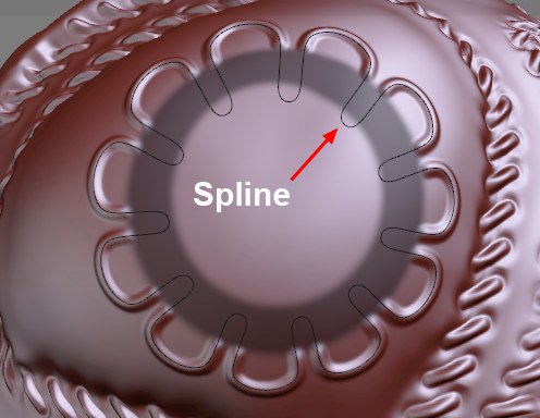 Die Splines müssen dabei nicht auf der Oberfläche des Sculpting-Objekts liegen: schieben und drehen Sie sich den Spline zurecht, sodass er optisch passend darüber schwebt. Folgen Sie dann mit dem Pinsel grob dem Spline (beachten Sie in diesem Zusammenhang Snapping-Radius). Der Pinselstrich wird sich dabei exakt nach dem Spline ausrichten.