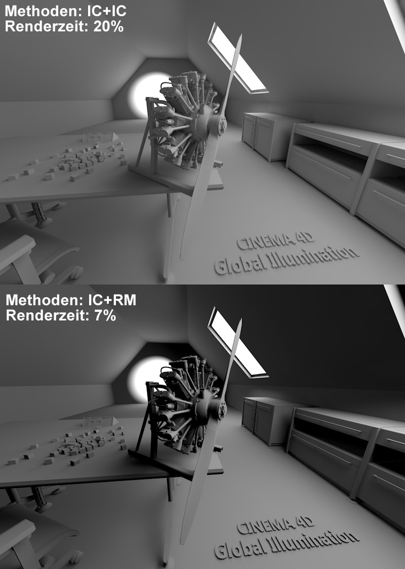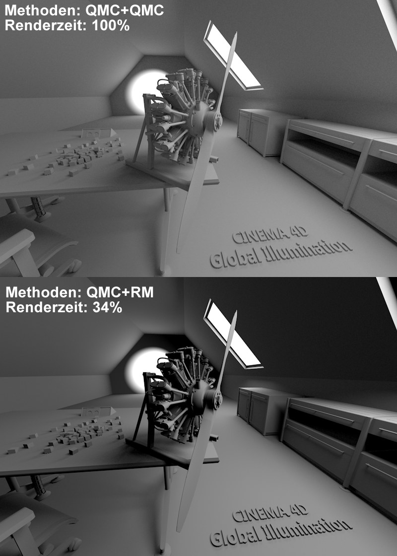 Beachten Sie, dass die Renderzeiten hier nur Trends vorgeben und bei anderen Projekten anders aussehen können (auch sinkt die Renderzeit bei IC+LM und QMC+LM noch einmal beträchtlich, wenn die Option Radiosity-Maps erstellen aktiviert wird). 100% Renderzeit wird für QMC+QMC als präziseste Methode definiert.