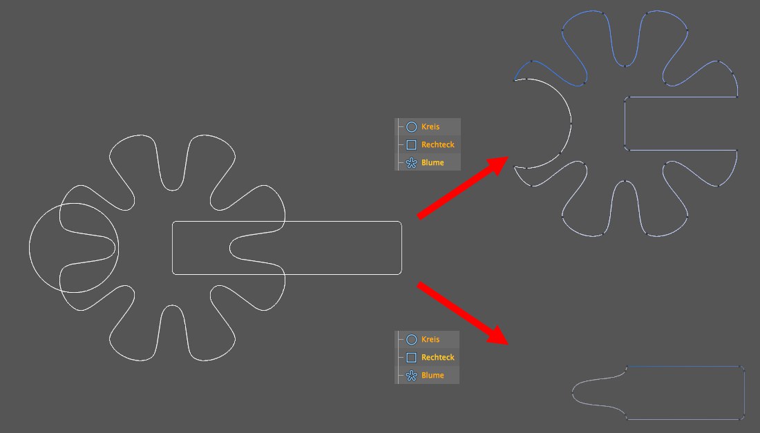 Beachten Sie, dass die generelle Selektionsreihenfolge aller beteiligten Splines ebenfalls Auswirkungen auf die Punktreihenfolge des resultierenden Splines haben kann (soll zuerst der Kreis oder das Rechteck aus der Blume geschnitten werden? In obigem Beispiel war es zuerst der Kreis, wobei der resultierende Spline dann auch am Kreis anfängt).