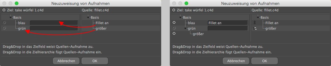- Sie ziehen den Take in eines der Verknüpfungsfelder, d.h. die überschriebenen Parameter der hinzu zu ladenden Datei werden in den entsprechenden Take integriert. In beiden Fällen wird der Zuordnungstyp durch ein kleines, entsprechendes Icon angezeigt (Abbildung rechts).
