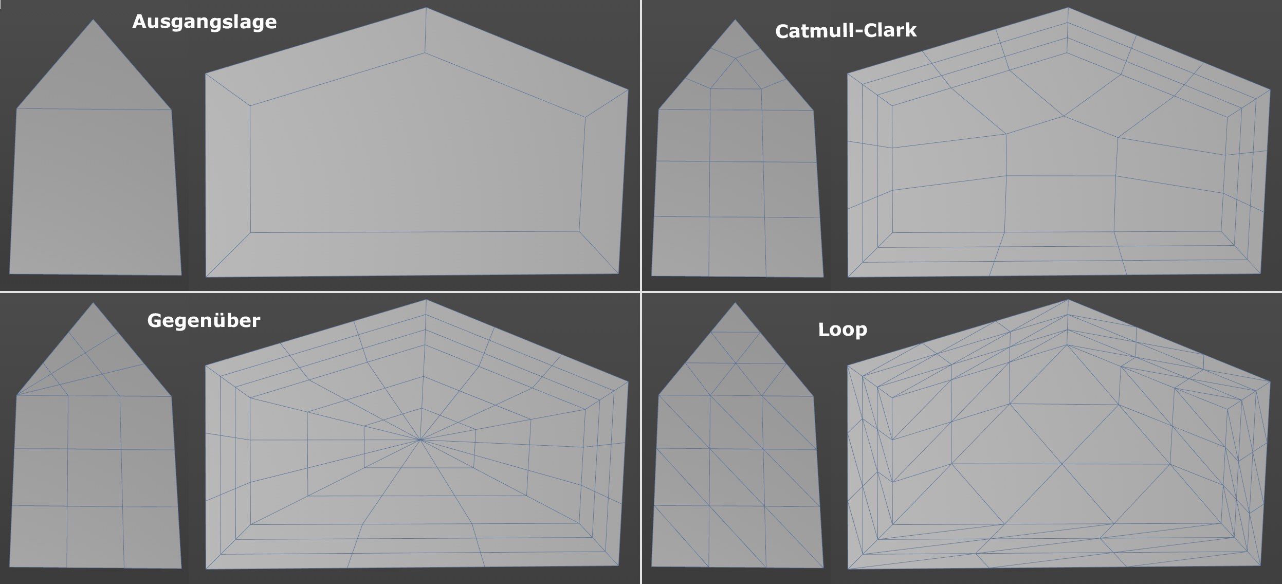 Links Ausgangszustand, dann Unterteilungen in den Modi Catmull-Clark, Loop und Gegenüber. Alle: mit aktivierter Weicher Unterteilung.