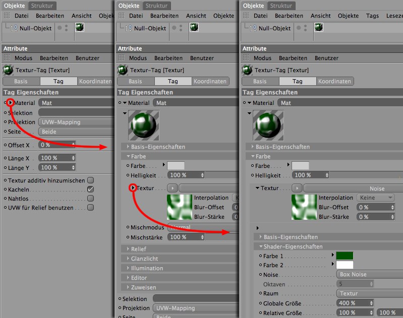 Ziehen Sie mit gedrückter Maustaste beispielsweise ein Material aus dem Material-Manager auf die Parameter-Gruppe Tag eines Material-Tags. Sollte diese noch nicht aktiviert sein, springt sie jetzt auf (das funktioniert übrigens auch mit Managern, die sich in gruppierten Tabs befinden).