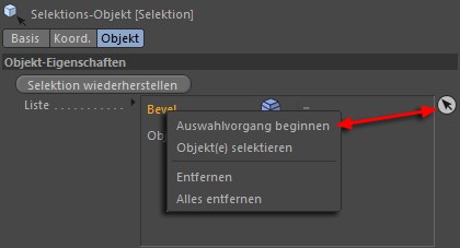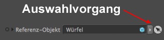 Überall dort, wo sich Verknüpfungsfelder oder Listen befinden, kann durch Klick auf den rechts angeordneten, runden Pfeilbutton (oder durch Auswahl des Befehls Auswahlvorgang beginnen des Kontextmenüs) ein Auswahlvorgang gestartet werden. Sie müssen dann mit der Maus nur noch das entsprechende Element (z.B. Objekt, Material, Tag, Ebene etc.) in der Ansicht bzw. im entsprechenden Manager auswählen. Das ausgewählte Element wird dann in das Verknüpfungsfeld geladen.