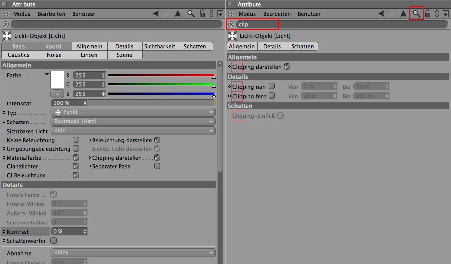 Haben Sie sich auf der Suche nach einem bestimmten Parameter schon jemals über einen überfüllten Attribute-Manager geärgert? Klicken Sie einmal auf das kleine Lupenicon rechts oben im Attribute-Manager. In der Filterzeile können Sie einen Filterbegriff eingeben. Es werden dann nur noch alle Parameter, die diesen Begriff enthalten, angezeigt. Dabei werden übrigens auch die Begriffe, die sich in Auswahlmenüs verbergen, berücksichtigt.