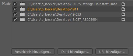 Sie finden z.B. in den Programmvoreinstellungen unter "Asset Browser" Pfadlisten, in denen Cinema 4D Asset-Datenbanken sucht. Die Bedienung dieses Interfaceelements funktioniert folgendermaßen: mit dem unten eingeblendeten Buttons können z.B. über Öffnen eines Dateiauswahldialoges Pfade hinzugefügt werden.
