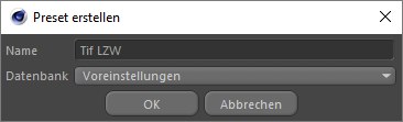 Unter Name geben Sie den Presetnamen an, unter dem das Preset auch in der Presetliste erscheint. Bei Datenbank wählen Sie eine solche aus. Meist haben Sie die Auswahl unter Voreinstellungen (Preset wird im Benutzerverzeichnis unter "userrepository" gespeichert) und manchmal Szene (Preset wird mit der Szene abgespeichert).