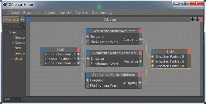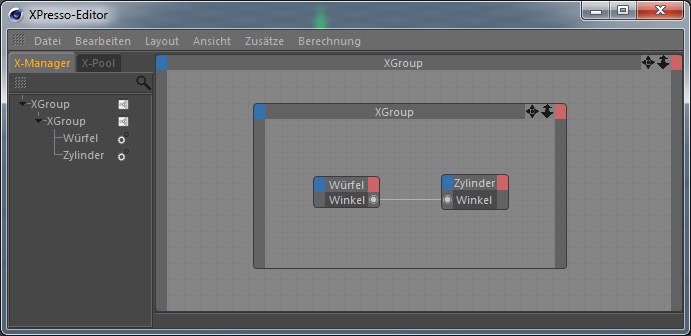 XGroups sind Behälter oder Container für Nodes oder andere XGroups und deren Verknüpfungen. Dabei können XGroups selbst auch wieder als Nodes fungieren und mit anderen Nodes oder XGroups verknüpft werden. XGroups lassen sich also hervorragend zur Organisation Ihrer XPresso-Schaltungen einsetzen, um für mehr Übersichtlichkeit im XPresso-Editor zu sorgen. Zudem lassen sich XGroups einzeln laden und speichern und machen somit die Benutzung einmal erstellter Schaltungen in verschiedenen Projekten einfacher.