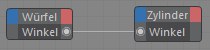 Diese Abbildung zeigt 2 Nodes, einen für einen Würfel und einen für einen Zylinder. Die zwei Kreise, beide heißen hier Winkel sind die Nodes. Die Ports unter der roten Schlatfläche sind Ausgangsports und senden Werte zu anderen XGroups (s. nächsten Abschnitt) und/oder Nodes. Die Ports unter der blauen Schaltfläche sind Eingangsports und empfangen Werte von anderen XGroups oder Nodes. In diesem Beispiel wird der (lokale) Winkel des Würfels dem (lokalen) Winkel des Zylinders zugewiesen. Damit zeigt der Zylinder in dieselbe Richtung wie der Würfel.