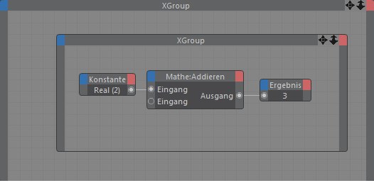 Übrigens ist bereits der XPresso-Editor selbst eine XGroup. Die Inhalte eines XGroup-Containers lassen sich über die aus den Editor-Ansichten bekannten Icons in der Titelzeile des XGroup-Fensters verschieben und zoomen. Verschiebungen können auch über die Pfeiltasten vorgenommen werden. Ein Klick auf die blaue oder die rote Schaltfläche in der Kopfzeile einer XGroup erlaubt die Auswahl von Datentypen für die Ein- und Ausgänge, wenn Sie eine XGroup mit anderen Nodes oder XGroups verbinden möchten. Dabei steht die blaue Schaltfläche für den Datentyp der Eingänge in die XGroup und die rote Schaltfläche für den Datentyp der Ausgänge. Diese Farbkonvention gilt auch für die Nodes.